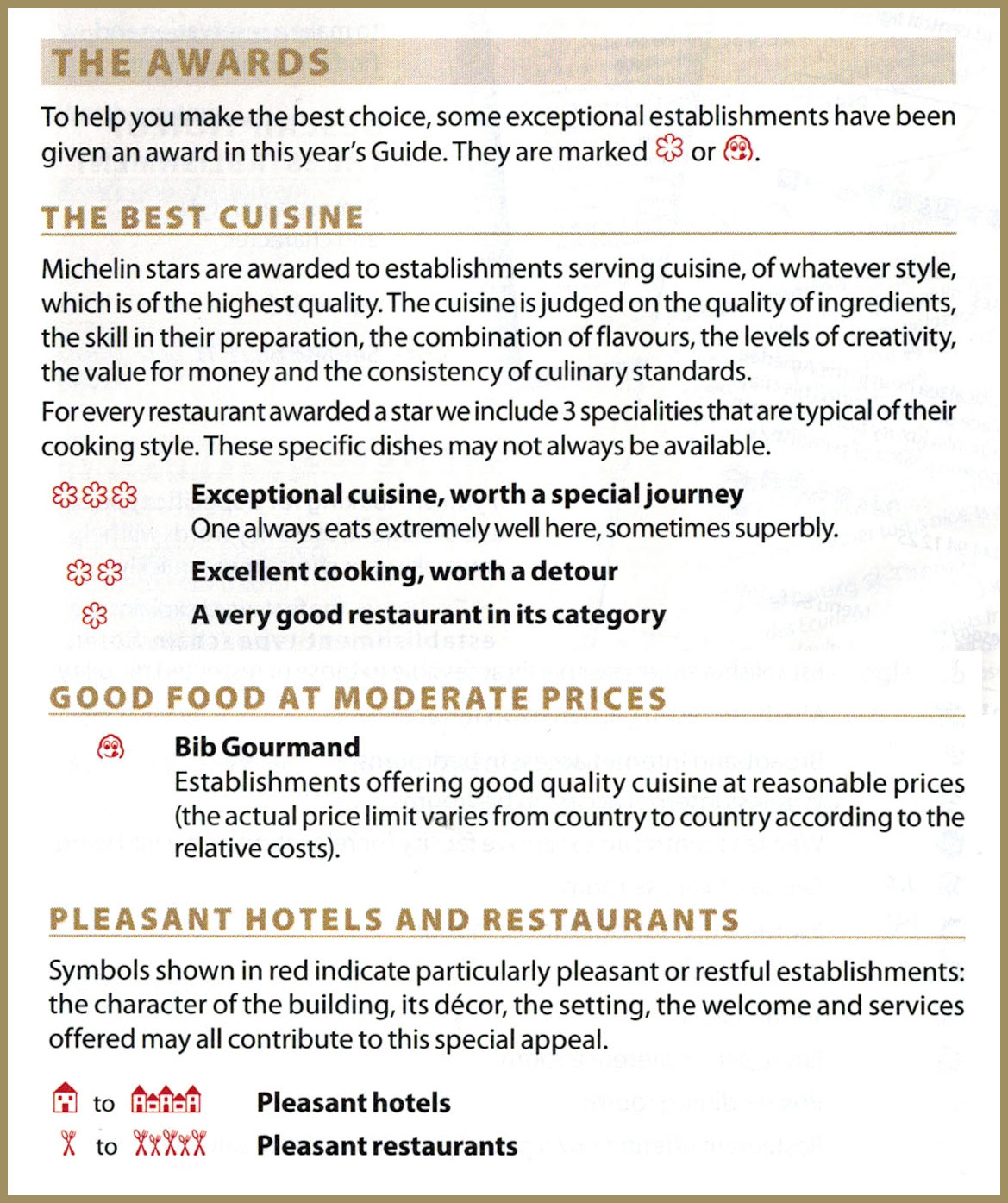 Den delades ut gratis till alla som köpte en bil. På den tiden fanns det cirka 3 000 bilar i hela Frankrike varav 95 procent av bilarna fanns i Paris. Det fanns inte så många mackar på den tiden så de första guiderna innehöll matnyttig information om var man kunde tanka, hur man bytte däck, glödlampor samt var man kunde äta en bit mat och sova över. Det övergripande syftet var och är fortfarande att stimulera resandet – något som fortfarande idag finns kvar i Michelins anda om – ”en bättre väg framåt”. Systemet med stjärnor introducerades under 30-talet.